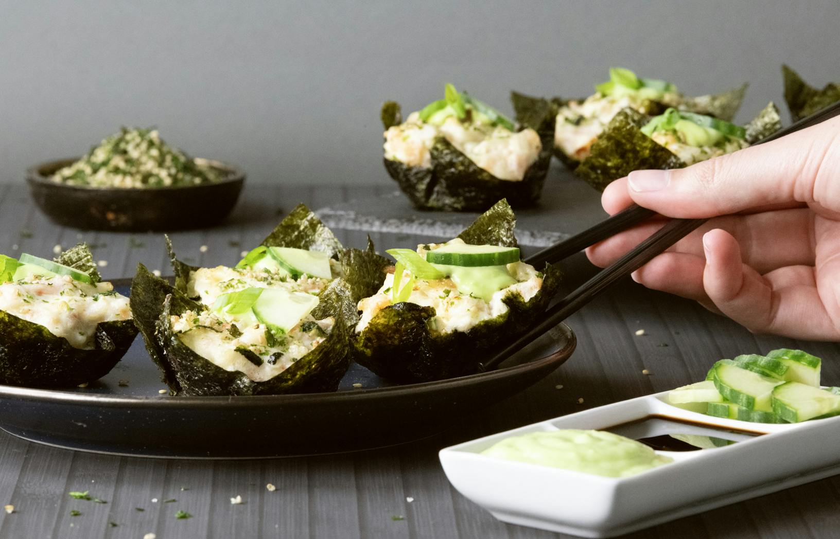 - Top with wasabi sauce, cucumber, and green onion.
